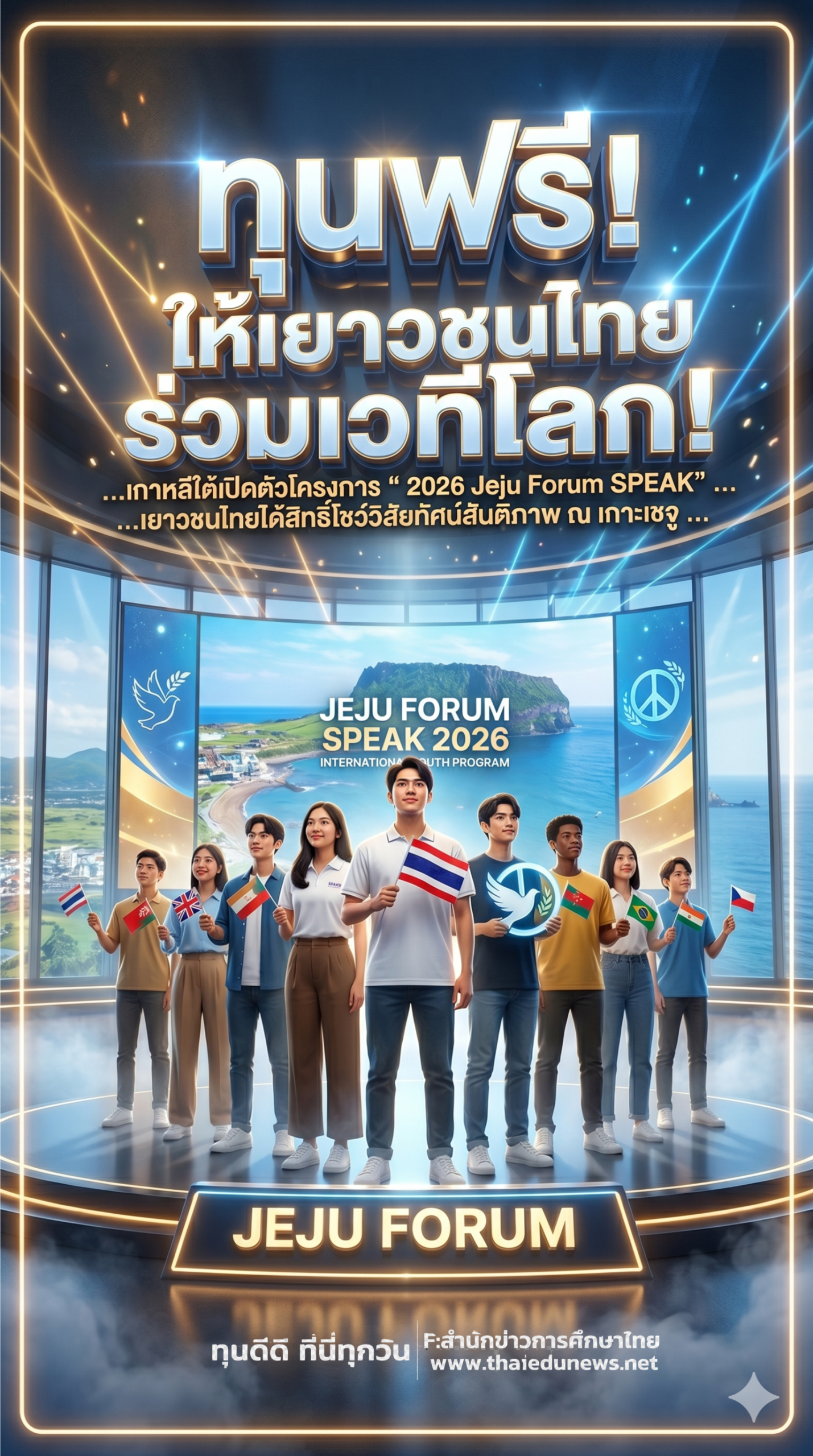 สำนักข่าวการศึกษาไทย (www.thaiedunews.net) – ข่าวดีสำหรับเยาวชนไทยที่มีหัวใจรักสันติภาพและความก้าวหน้าของโลก เมื่อเครือข่ายความร่วมมือระดับสากลประกอบด้วย WFUNA (สมาคมสหประชาชาติแห่งโลก), UNDPPA (กรมกิจการการเมืองและการสร้างสันติภาพแห่งสหประชาชาติ) และ UNITAR CIFAL Jeju ผนึกกำลังเปิดตัวโครงการเยาวชนนานาชาติครั้งยิ่งใหญ่ “2026 Jeju Forum SPEAK” ณ เกาะเชจู ประเทศเกาหลีใต้